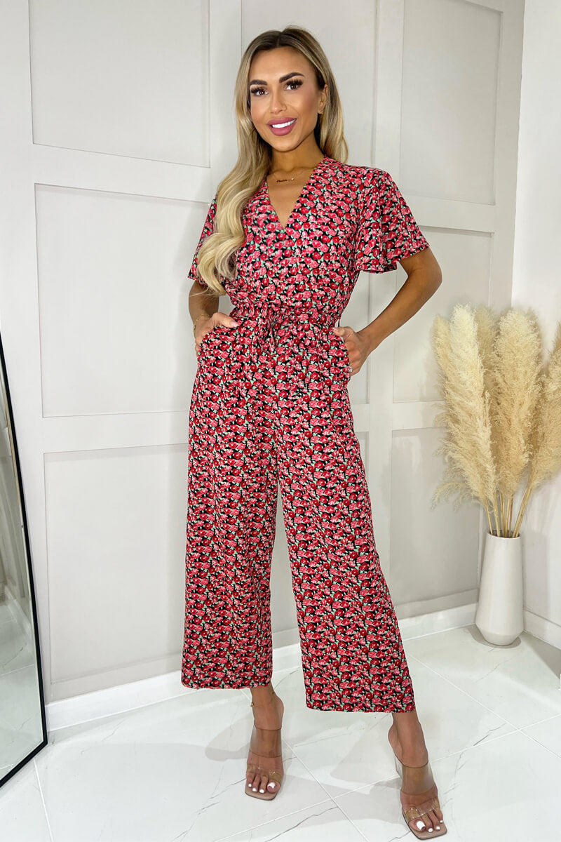 Look chic this season in our Red Floral Printed Butterfly Sleeve Belted Jumpsuit! Featuring a wrap over v neckline, short butterfly sleeves and pockets. Pair with heels and a handbag for a day to night look!