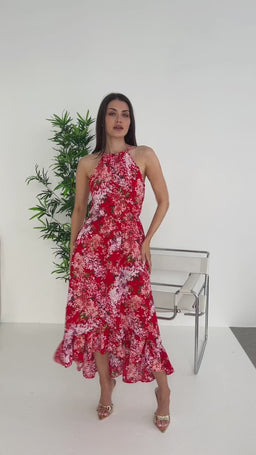 Our Red Floral Printed Frill Hem High Neck Midi Dress is perfect for holidays and summer weddings. Featuring a high neck top with adjustable straps, back button loop closure, an elasticated waist and a dip hem midi skirt with frill hem. Style with heels and a clutch bag for the perfect summer occasion outfit.