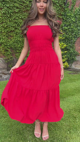 Our Red Frill Strap Tiered Midi Dress is right on trend this season! Featuring ruffled straps, straight neckline, elasticated waist and a tiered smocked midi skirt. Keep it casual with trainers or dress it up with heels and a matching bag.