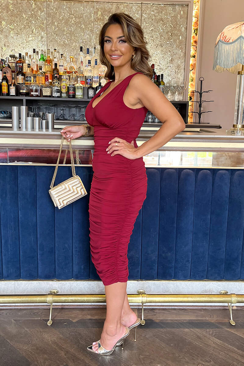 Look and feel gorgeous in our Wine V Neck Ruched Bodycon Midi Dress. Featuring a V shaped neckline and V shaped back, a ruched midi skirt and zip up back. Style with strappy heels and your favourite jewellery for the perfect party outfit.