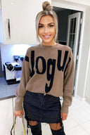 Stay cosy this season in this Camel V Slogan Knitted Jumper! Featuring a soft knitted material with a v slogan print. Pair with jeans or leather pants.