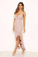 Our Mushroom Asymmetric Frill Hem Midi Dress is perfect for any special occasion this season. Featuring a wrap over neckline, slit from the knee, asymmetric frill hem line and a zip fastening. Style with heels and a clutch to complete the look!