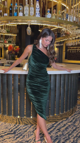 Green Velvet One Shoulder Asymmetric Hem Ruched Midi Dress