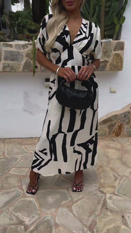 Black And Cream Abstract Print V Neck Batwing Midi Dress