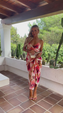 Seriously eye-catching, our Peach Smudge Print Strappy Wrap Top Knot Skirt Midi Dress is a must have this season. Featuring adjustable straps, a v neck wrap top, side zip and a knot front draped midi length skirt with split. Pair with strappy heels, a matching bag and your favourite accessories for the most glam evening look!