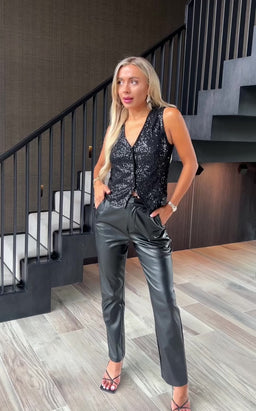 Our Black Sequin Button Front Waistcoat adds a festive spin to a classic must-have. Featuring our stunning sequin fabric, a lined button front and a semi-sheer back. Team our waistcoat with jeans and boots for a casual party look or dress it up with straight leg trousers and heels to create a chic evening outfit.