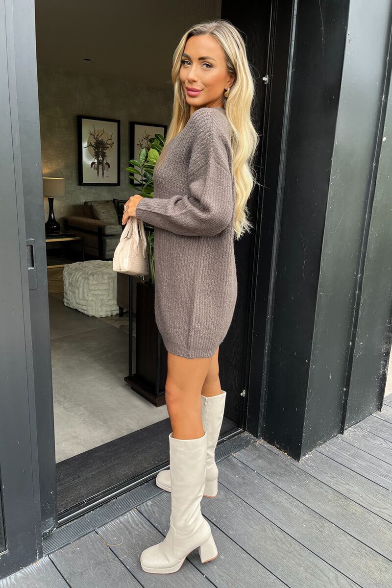 Mink V-Neck Knitted Jumper Dress