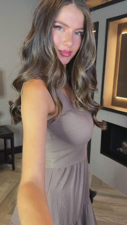 Our Mocha Round Neck Ribbed Top Tiered Skirt Midi Dress will be yournew summer go-to. Featuring a ribbed sleeveless top, a round neckline,a tiered smock-style midi skirt and a zip up back. Wear it with flatsfor a super cute day look, or dress it up with heels for the evening.
