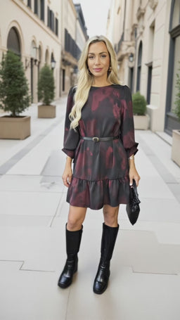Feel pretty this season in our Plum And Black Smudge Print Frill Hem Belted Mini Dress. Featuring a round neck, back loop closure, 3/4 length cuffed sleeves, a frill hem skirt and a black faux leather belt. Style it with boots for a cute daytime look, or wear it with heels for an effortless evening outfit.