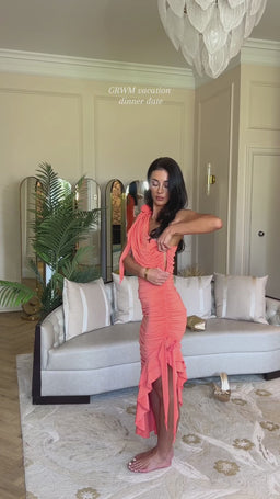 Get ready to stand out from the crowd with our Peach One Shoulder Ruched Asymmetrical Frill Midi Dress With Flower Details. This classy ruched bodycon dress features a one shoulder top, an asymmetrical frill midi skirt, flower detailing and a side zip. Style with strappy heels and minimal jewellery to complete the look.
