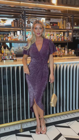 Our Plum Sparkle Ring Detail Wrap Midi Dress is a party wardrobe must-have. Featuring our all-over sparkle stretch fabric, a V-shaped wrap neckline with inner rubber facing, an elasticated waist with a silver O-ring detail, butterfly sleeves and a midi wrap skirt. Pair it with some cute heels and statement earrings to make an impression at your next festive event.