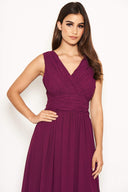Look elegant in out plum pleated V neck maxi dress. Featuring a zip fastening, pleated wrap over bodice and V neckline. This dress is perfect for any upcoming special occasion. Simply pair with barely there heels and a clutch to finish the look!