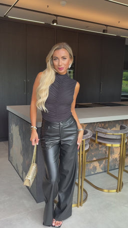 Be right on trend in our Black High Neck Sleeveless Ruched Mesh Bodysuit! Featuring a ruched mesh body with lining, snap fastening and zip up back. Pair with leather looks, heels and your favourite jewelry for the perfect evening look.
