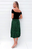 We love this Black And Green Animal Print 2 In 1 Pleated Midi Dress! Featuring a green animal print pleated skirt and a black bardot top this dress is super cute! Pair with some heels for a glam night out look!
