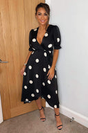 Black And Stone Polka Dot Wrap Side Tie Midi Dress