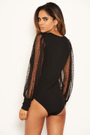 We are obsessed with this Black Dobby Mesh Long Sleeve Bodysuit! Easily dressed up or down to suit your style! Featuring a classic black bodysuit style with dobby mesh sleeves and a black cuff to keep the arm in place. Team this with some leather jeans and heeled boots for a dressed up look!