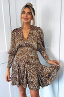 Brown And White Spotty V-Neck Long Sleeve Skater Dress
