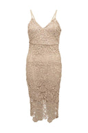 As seen on Sam Faiers. All that glitters is definitely gold! Be party ready this season with this beautiful gold crochet midi dress. With a bodycon silhouette and delicate layering of the detailing, the flattering shape of the neckline and thin straps, you really can do no wrong with this dress! Pair with our metallic heels for a truly indulgent outfit!