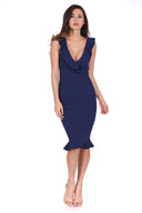 Turn heads in our navy flirty midi v neck frill dress. Perfectly fitted to accentuate your curves for that all important occasion! Style with a pair of nude heels to complete the look.
