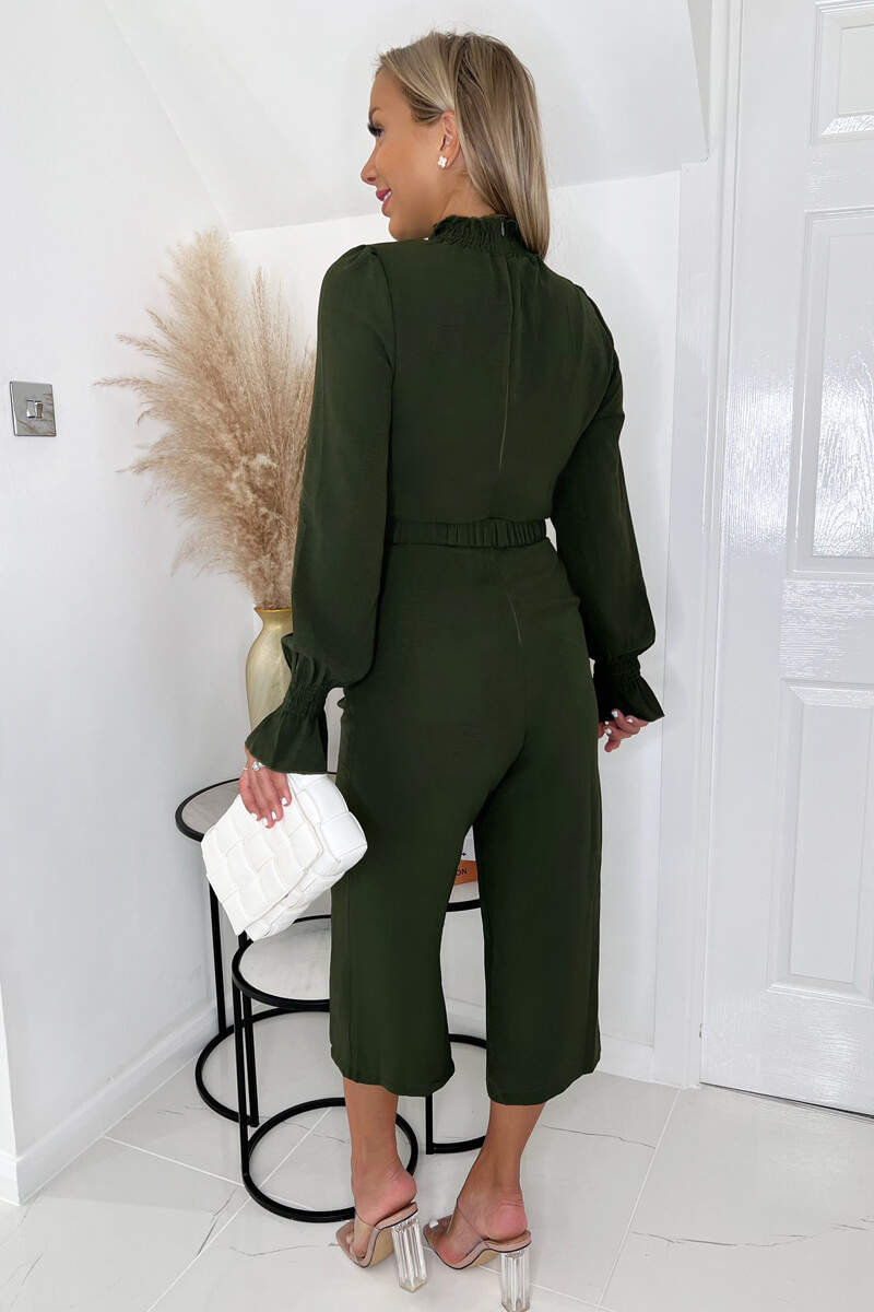 Our Olive High Neck Long Sleeve Belted Jumpsuit is perfect for any occasion, featuring a gold clasp belt, a shirred high neck with matching shirred sleeves and a zip up back! Dress up with heels or for a more casual look add trainers or flats.