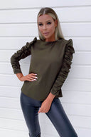 Our Olive Ruched Sleeved Top would be great for a perfect night out! Featuring ruched sleeves, back button fastening and a loose comfortable fit. Style it up with some black leather jeans a pair of strappy heels, glam accessories and a clutch bag to match making it the perfect outfit.